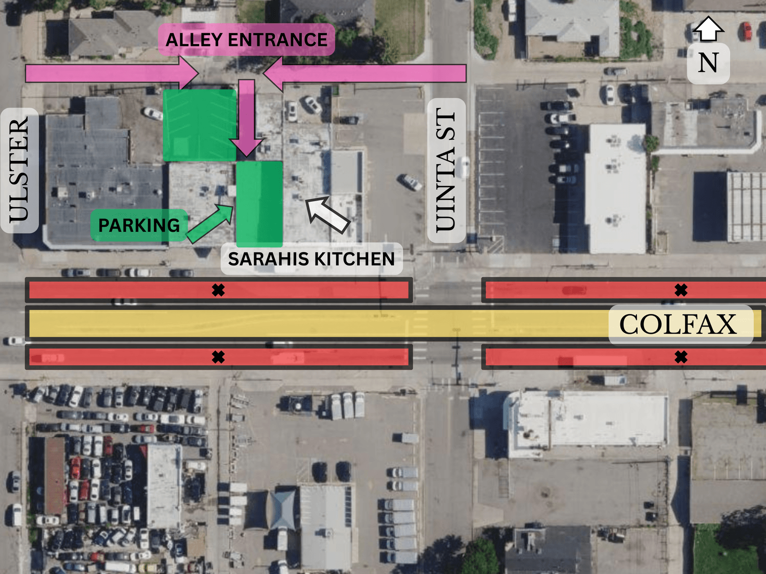 DUE TO RECENT CONSTRUCTION ON THE EAST COLFAX BUS RAPID TRANSIT PROJECT- The restaurant will be using the alley way entrances and parking lots. PLEASE TAKE A LOOK AT THE IMAGE BELOW FOR ACCESS INSTRUCTIONS.